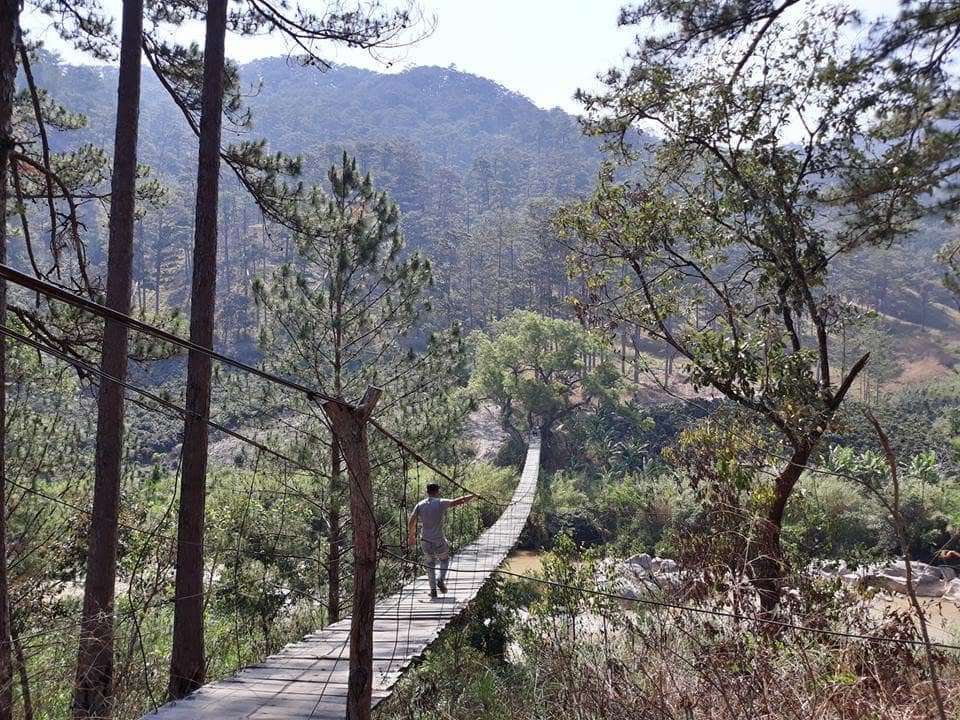 - Xung quanh cầu là khung cảnh núi non, rừng thông, cỏ cây vô cùng hùng vĩ. Gần khu vực đó còn có cả những rẫy cà phê, những căn chòi gỗ rất đẹp. Các bạn có thể tranh thủ làm vài bức ảnh sống ảo để đời nhé!